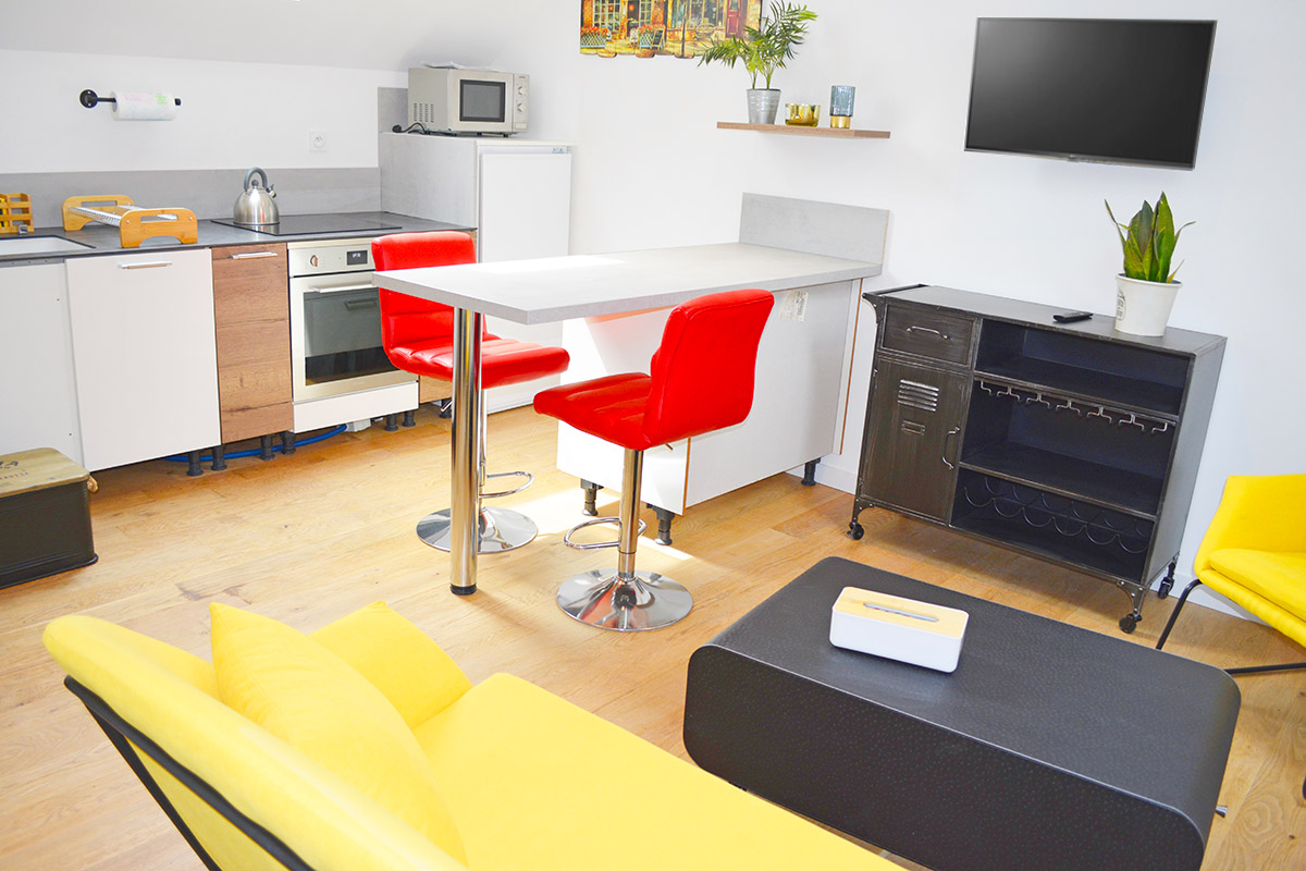 Le gîte climatisé de 60m², situé au premier étage, est entièrement équipé afin que votre séjour soit parfait ! Dans la pièce principale, vous disposez d'un salon avec une télévision, une cuisine totalement équipée. Vous pourrez vous détendre ou cuisiner en toute tranquilité et indépendace. Le coin chambre dispose d'un lit de 160cm. Une literie haut de gamme et des équipements modernes sont pensés pour que votre séjour soit le plus agréable possible.